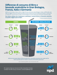 Con una media di 5 consumazioni al mese, la Gran Bretagna è la nazione in cui si consumano più bevande analcoliche. Sul fronte della birra invece lo scettro resta saldamente in mano alla Germania che spicca con 3,8 consumazioni al mese. E’ quanto emerge dalla infografica rilasciata da Npd Group che fotografa il consumo di birra e bevande analcoliche nell’anno mobile terminante a marzo 2016 presso la Ristorazione Commerciale nei quattro maggiori Paesi Europei: Gran Bretagna, Francia, Italia e Germania.