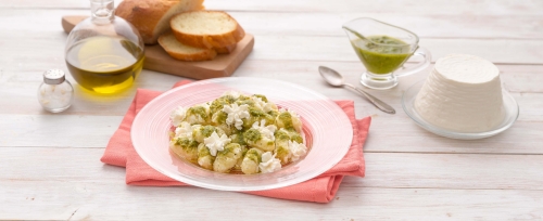 Dopo aver lavato e asciugato le foglie di basilico, versatele nel mixer con i pinoli ed un pizzico di pepe. Mentre si frulla, versare l’olio a filo fino ad ottenere un pesto corposo. In una ciotola capiente versare 600g di ricotta Vallelata, la farina, il formaggio ed una presa di sale.Impastare il tutto fino ad ottenere un composto omogeneo.Dal composto ricavare dei cordoncini di 1,5cm di diametro circa e tagliarli a tocchetti di circa 2cm di lunghezza. Far bollire gli gnocchi di ricotta in abbondante acqua salata fino a che non vengono a galla. Scolarli e condirli con il pesto preparato mescolato a due cucchiai di acqua di cottura. Servite nei piatti e guarnite con ciuffetti di ricotta Vallelata rimasta.