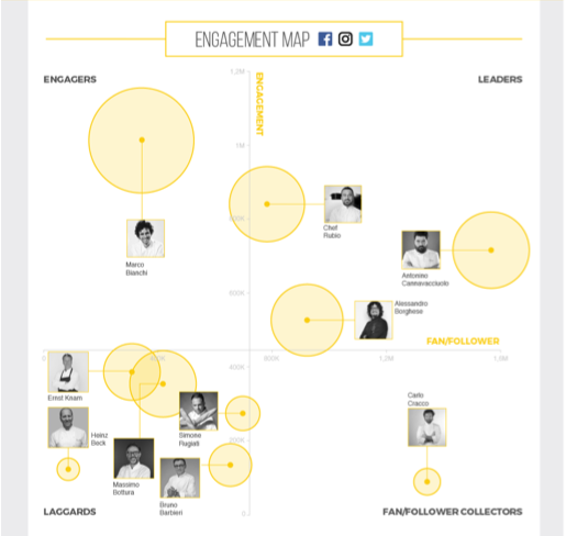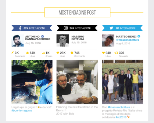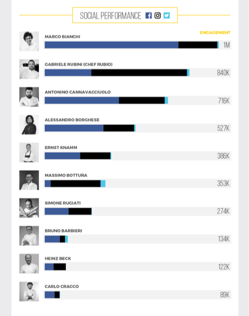 Su Instagram il più influente è Chef Rubio, ma il post più engaging è quello dello chef Massimo Bottura, chef e proprietario dell’Osteria Francescana a Modena, classificatosi primo ristorante al mondo nella lista dei The World’s 50 Best Restaurants Awards 2016 di New York. Nel post lo troviamo in compagnia della star di Hollywood Robert De Niro.