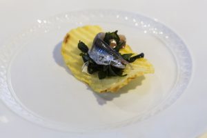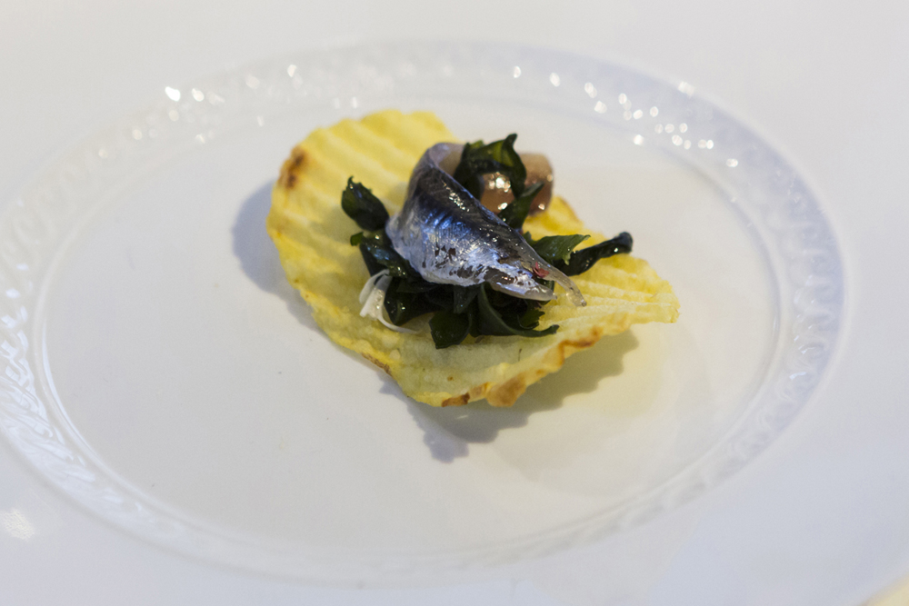 Lavare e pulire privando della testa e della lisca le alici. Lasciarle marinare in sale e zucchero in parti uguali, insieme a qualche grano di pepe rosa. Reidratare le alghe in acqua. Una volta reidratate, scolarle e condirle con sale e olio evo. Adagiare un filetto di acciuga e un ciuffo di alghe sulla rustica. Servire.