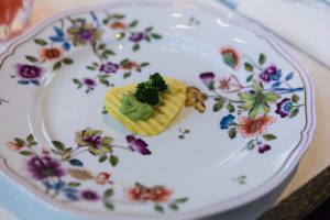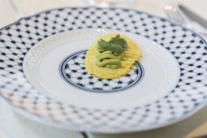 Preparare una purea di avocado con un mixer. Tagliare l’avocado a pezzetti, condire con lime, sale, pepe e poco olio evo. Preparare una quenelle di avocado, guarnire con foglie di coriandolo e scorza di limone.