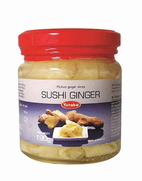 Terminata questa semplice operazione, ora basta tagliare in parti uguali e servire guarnendo con salsa di soia, pasta wasabi e zenzero. Lo zenzero di YUTAKA - Sushi Ginger - è proprio speciale! Nella confezione in vetro da 190 grammi viene proposto sotto forma di lamelle di zenzero marinate ottime per accompagnare tutti i piatti tipici della vera cucina giapponese.