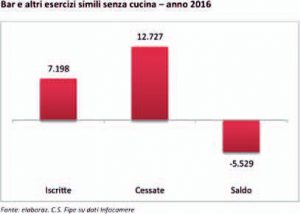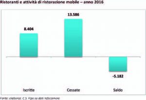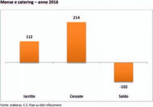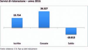 Il turn over imprenditoriale nei servizi di ristorazione resta elevato. Nel 2016, il saldo tra le imprese iscritte e cessate nei “servizi di ristorazione”, al lordo delle cessate d’ufficio, è stato pari a -10.813 unità, in crescita rispetto ad un anno fa quando toccò quota -10.720. Un risultato dovuto prevalentemente alla riduzione delle iscritte.