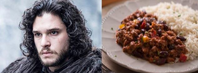 E’ l’eroe affascinante, colui che si sospetta riuscirà a salvare tutto il regno, da una parte Stark ma figlio di madre sconosciuta. E’ risaputo che John Snow non sappia niente. Ha vinto sulla morte e ha combattuto contro gli Estranei tornando da oltre la Barriera. Se Snow fosse un piatto sicuramente sarebbe “Chili con manzo e riso”, carattere forte, sapore deciso, contrasti netti e no, la scelta della carne non è un caso.