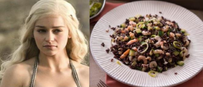 Non è solo una delle protagonisti più belle e affascinanti, lei è "Nata dalla tempesta", la prima del suo nome, regina degli Andali, dei Rhoynar e dei Primi Uomini, signora dei Sette Regni, protettrice del Regno, principessa di Roccia del Drago, khaleesi del Grande Mare d'Erba, "la Non-bruciata", "Madre dei Draghi", regina di Meereen, "Distruttrice di catene"e blablabla, chi più ne ha più ne metta. Esotica, dolce ma risoluta, ci aspettiamo grandi cose e grandi amori da parte della giovane Targayren, che riesce sempre a stupirci. Il suo piatto non potrebbe che essere “Riso venere e gamberetti” dove la sensualità si prova a ogni assaggio. Il riso venere richiama i paesaggi esotici che hanno accompagnato Daenerys e i gamberi rimandano al passaggio verso Westeros di cui tutti siamo in attesa!