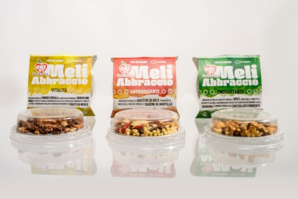 Per concedersi un break gustoso ma sano ed equilibrato, Ad Chini, azienda specializzata nella trasformazione delle mele e concessionaria del marchio Melinda, ha creato Meli Abbraccio: gustosissime mousse di mela da mixare con ben 3 diversi topping composti da frutta secca, frutta a guscio, cereali, semi e bacche del benessere: