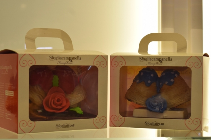 In occasione della festa degli Innamorati, il dolce raddoppia: due sfogliacampanelle al gusto “bacio” legate da una raffinata decorazione in pasta di zucchero. La pasticceria classica napoletana incontra dunque l’arte del cake design per creare un prodotto goloso e unico.