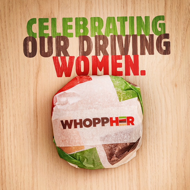 Per celebrare tutte le donne al volante, Burger King presenta un hamburger Whopper davvero speciale, creato appositamente per loro: il Whopper. Tutte le donne che in Arabia Saudita entreranno guidando in un King Drive - il servizio drive-thru di Burger King –, riceveranno un Whopper in omaggio. L’evento avrà la durata di un mese a partire dall’entrata in vigore del nuovo decreto e terminerà il 24 luglio 2018.