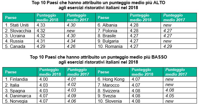 Italia mon amour - Anche nel 2018 il mondo della ristorazione italiana ha raccolto un generale apprezzamento da parte dei viaggiatori stranieri, leggermente più alto di quello degli italiani, che confermano la loro severità verso la propria offerta gastronomica, sorpassata solo dai finlandesi e seguita dagli spagnoli. Ma la buona notizia è che tutti e tre i Paesi, anche se al top della classifica dei punteggi più bassi, hanno comunque dato un ottimo punteggio agli esercizi ristorativi italiani: 4 e 4.03 su un massimo di 5. La nazione che apprezza invece di più la cucina italiana sono gli Stati Uniti con un punteggio medio delle recensioni di 4.33 (l’anno scorso la Top 10 era capitanata dalla Russia con un punteggio di 4.34 che quest’anno è sceso a 4.31 piazzandola in quarta posizione). Nuovi estimatori dell’offerta gastronomica del Bel Paese rispetto allo scorso anno sono Slovacchia (4.32), Albania (4.28) e Bulgaria (4.27), che prendono il posto di Israele, Cile e Ungheria, che restano fuori dalla classifica di quest’anno.