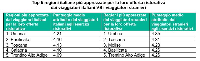 Le regioni italiane un anno dopo: i gusti degli utenti rimangono (quasi) gli stessi - L’Umbria si riconferma regina della cucina italiana! Non solo quest’anno è prima sia per gli italiani sia per gli stranieri ma era al vertice di entrambe le classifiche anche lo scorso anno. Le new entry del 2018 sono invece la Calabria, quarta per gli italiani (punteggio medio: 4.10), che prende il posto della Valle d’Aosta, e il Molise, terzo per gli stranieri (punteggio medio: 4.28), che rimpiazza l’Abruzzo. Toscana, Basilicata e Trentino Alto Adige rimangono nel cuore dei buongustai anche quest’anno.