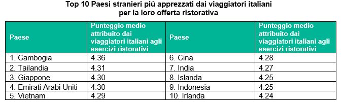 E gli italiani all’estero? - Analizzando i punteggi medi dati dai viaggiatori italiani ai ristoranti nel mondo, una chiara e crescente preferenza è data ai Paesi orientali, ancor più del 2017: 8 dei 10 Paesi più apprezzati dai viaggiatori italiani per la loro offerta ristorativa sono infatti in Asia (l’anno scorso erano 6). Le sole nazioni al di fuori del continente asiatico sono in Europa: Islanda (ottava) e Irlanda (decima).