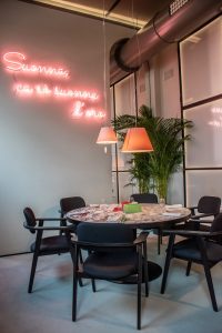 Il locale è nato dalla ristrutturazione di una vecchia officina di moto, cercando di proporre un abito trasversale da indossare a tutte le età. Linee semplici ma raffinate, toni sobri con dettagli vivaci, come la carta da parati che fa da sfondo all’elegante bancone bar, perfetto anche soltanto per un aperitivo.
