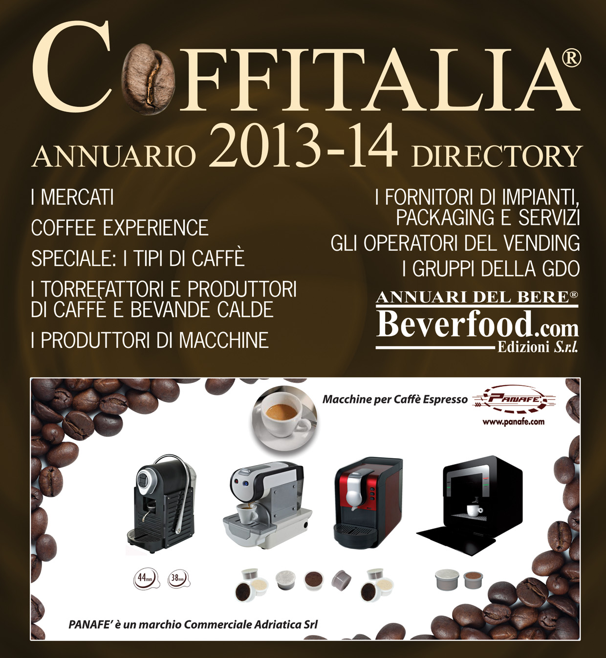 Con un consumo totale annuo intorno ai 248 milioni di kg di prodotto tostato ed un giro d’affari alla produzione pari a circa 3,7 miliardi di euro, di cui un miliardo di euro destinati all’esportazione, il mercato italiano del caffè è uno dei più caratteristici e vivaci del settore food & beverage. Coffitalia® 2013-2014, il nuovo annuario della società Beverfood.com Edizioni di Milano, ricostruisce e aggiorna lo spaccato dell’intera filiera settoriale con riferimento a mercati e quadro competitivo, produttori e torrefattori, operatori del coffee trading, produttori di macchine del caffè e vending, fornitori di impianti e macchinari per la torrefazione, e ancora fornitori di packaging, di materiali per i punti di vendita, di servizi. Senza dimenticare catene di caffetterie, gruppi e operatori del vending, gruppi della grande distribuzione, della ristorazione e dell’ingrosso, associazioni settoriali in Italia e nel mondo, manifestazioni fieristiche.