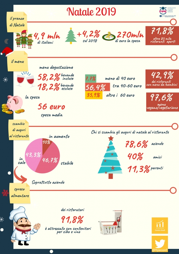 Rispetto allo scorso anno si tratta di oltre 200mila persone in più pronte a trascorrere il pranzo del 25 dicembre fuori casa e sostenere una spesa media di 56 euro a persona, per un volume d'affari complessivo di 270 milioni di euro, 30 milioni in più rispetto al 2018.