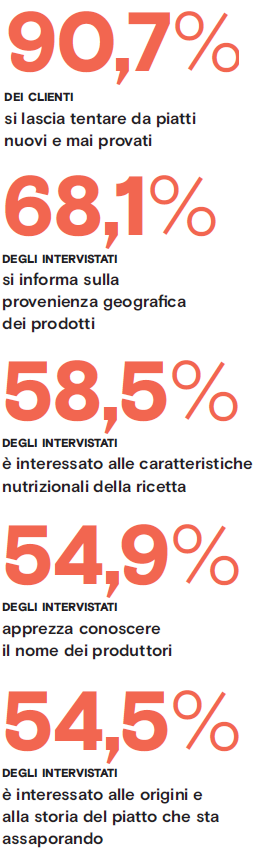 La tradizione è il fattore più attrattivo che motiva la scelta di un’insegna e di un locale. Cambiano gli stili di consumo dei cittadini sempre più attenti alla qualità e provenienza dei prodotti che ordinano fuori casa: otto consumatori su dieci sono al corrente del fatto che i ristoranti che frequentano abitualmente utilizzano prodotti del territorio. Sono gli stessi ristoratori o il personale di sala a fornire le informazioni. Secondo una indagine Fipe, il 50% degli intervistati, cerca e trova nei locali che frequenta un’ampia offerta di prodotti del territorio, preparati con ricette classiche ma non solo. Il ristorante è anche luogo di scoperta, il 90,7% dei clienti confessa di essersi fatto tentare da piatti nuovi e mai provati, mentre il 60,5% ammette di andare al ristorante anche per affinare il proprio palato. Tutti, o quasi, concordano, però su un punto: è fondamentale sapere ciò che si mangia, e il ruolo del personale di servizio per la presentazione e illustrazione dei piatti viene fuori in modo evidente. Il 68,1% dei clienti quando entra al ristorante, per prima cosa si informa sulla provenienza geografica dei prodotti, il 58,5% sui valori nutrizionali dei piatti e il 54,5% sull’origine e la storia di una ricetta.