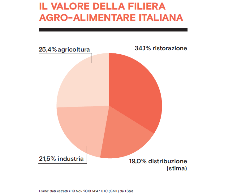 La filiera agro-alimentare italiana vale 135 miliardi di euro. La ristorazione con 46 miliardi di euro è il primo comparto di questa filiera, seguito dall’agricoltura con 25 miliardi di euro. La ristorazione è un comparto decisivo della filiera non soltanto per il contributo fornito alla creazione di valore ma anche per essere un mercato di sbocco rilevante per le produzioni agroalimentari nazionali.