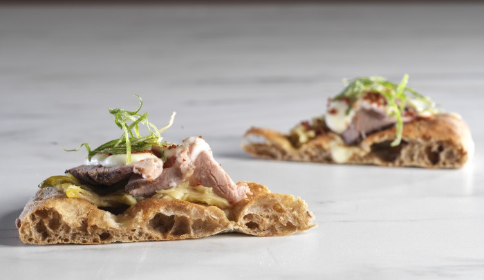 Base rustica Tonda 31 per Marco Bovio, titolare del Ristorante Pizzeria “Giotto” a Bari che nella sua ricetta “Sole di Puglia” riproduce all’ennesima potenza un ventaglio dei sapori più intensi della sua terra: dal Primitivo di Manduria utilizzato per la coppa di suino in marinatura, al Caciocavallo Podolico, alle cipolle sponsali dai cui ciuffi ricava la parte decorativa finale, ai pomodorini secchi che soltanto il sole di Puglia rende così saporiti.