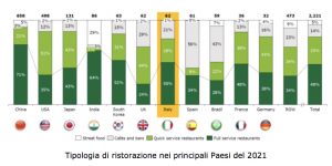 Con il 44% di market share, la Cina guida per valore del Full Service, seguita a distanza dagli USA (16%). L’Italia si posiziona sesta a livello globale per diffusione, con un rialzo del +14,5% dall’anno precedente (CAGR 20-21) e un valore di 31 miliardi di euro. Nel nostro Paese 1 attività ristorativa su 2 sceglie questo formato, mentre la restante metà si