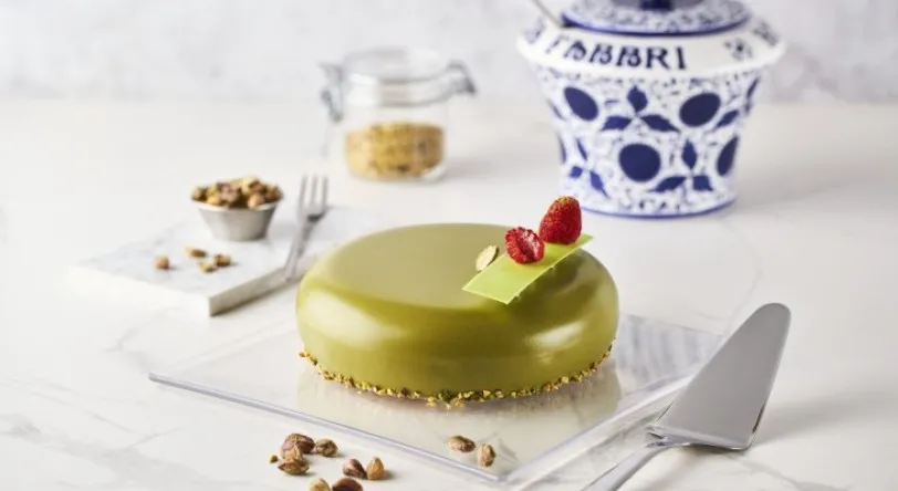 Una volta composta va rifinita con una cascata di Crema Fabbri al pistacchio. Il risultato finale sarà una torta che niente ha da invidiare alle preparazioni di pasticceria.