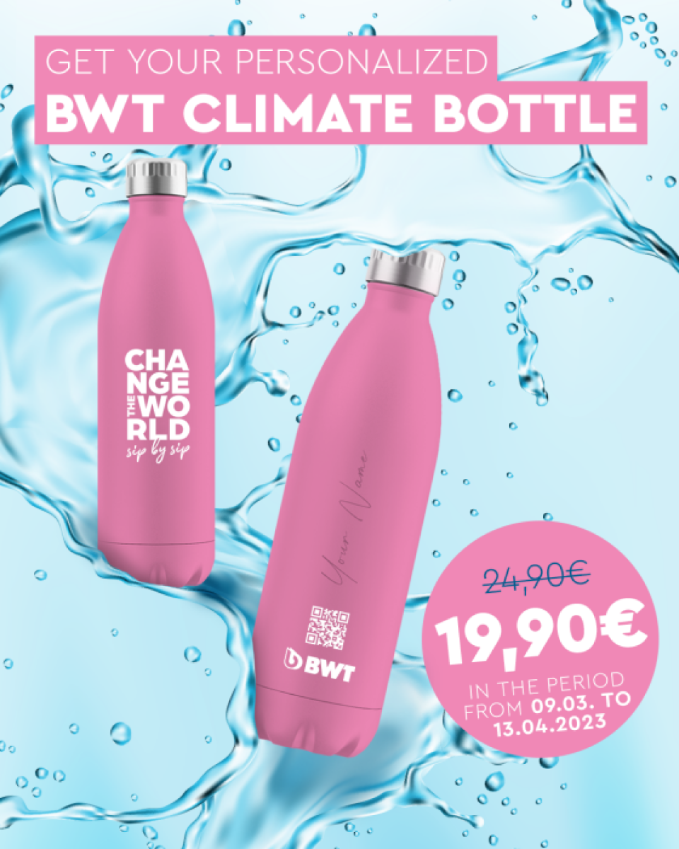 Vi manca una bottiglia BWT? Nessun problema, per tutto il periodo dell’iniziativa BWT offre a tutti la Climate Bottle personalizzabile ad un prezzo speciale cliccando qui