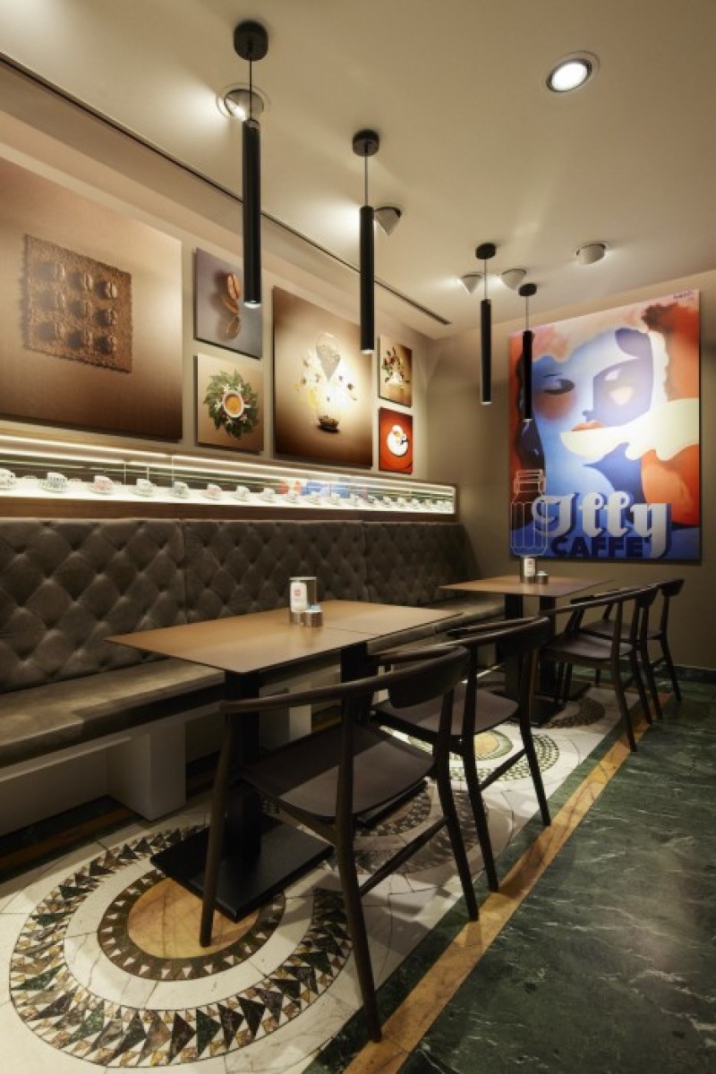 Fin da subito l’attenzione del visitatore viene attirata dallo scenografico chandelier che riunisce in una spirale sospesa le illy Art Collection, simbolo del rapporto tra illy e il mondo dell’arte contemporanea. Anima del locale e unicum tra i caffè illy, l’ampio bancone, arricchito con una vetrina angolare per amplificare l’esposizione della rinnovata offerta food, differenziata e studiata per ogni momento della giornata, è qui rivestito a specchio per valorizzare l’elegante pavimentazione del locale, formata da decori geometrici composti da diverse tipologie di marmi tagliati e posati a mano da artigiani specializzati.