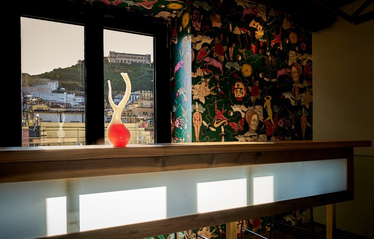 Anthill è dunque l’elemento aggiunto di un progetto poliedrico che ha tra i suoi obiettivi quello di attrarre una clientela certamente esigente, ma soprattutto curiosa. Il locale è spazioso, oltre 330 metri quadri di superficie, di cui 180 all’interno dove si contano 25 posti a sedere e 12 al banco, e 150 nella terrazza esterna con vista dall’alto di Napoli.