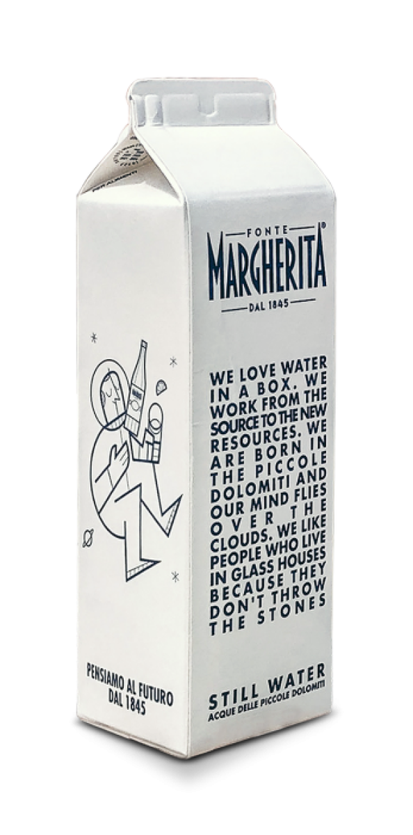 Per una precisa scelta di sostenibilità ambientale Fonte Margherita imbottiglia solo in vetro, per lo più a rendere, e nel brick in cartone interamente riciclabile. Spritz Zero, Gin Tonica Zero e Bellini Zero sono disponibili nelle originali bottiglie di vetro che rimandano ai tempi passati così come le etichette che sono state rivisitate in chiave contemporanea da importanti designer.