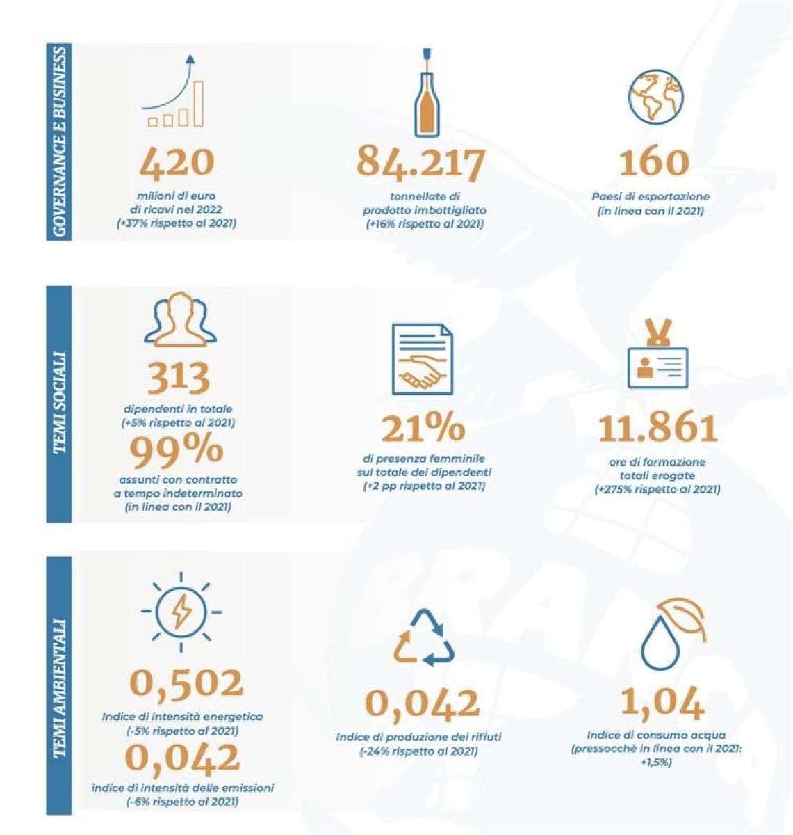 Per quanto riguarda la produzione, il volume di prodotto imbottigliato ha raggiunto le 84.217 tonnellate, con una crescita del 16% sul 2021. In crescita per il terzo anno consecutivo anche il valore economico generato dal gruppo, che ha toccato quota 420 milioni di euro, +37% sul 2021, considerando produzione e vendite totali dei prodotti in portfolio. Oltre l’87% del valore complessivo generato (che con l’aggiunta dei proventi da attività finanziarie della Holding e investimenti in ambito Real Estate ammonta a 443 milioni di euro complessivi), pari a più di 386 milioni di euro, è stato distribuito ai diversi stakeholder, in crescita del 29% rispetto al 2021, a conferma di un trend in aumento da tre anni.