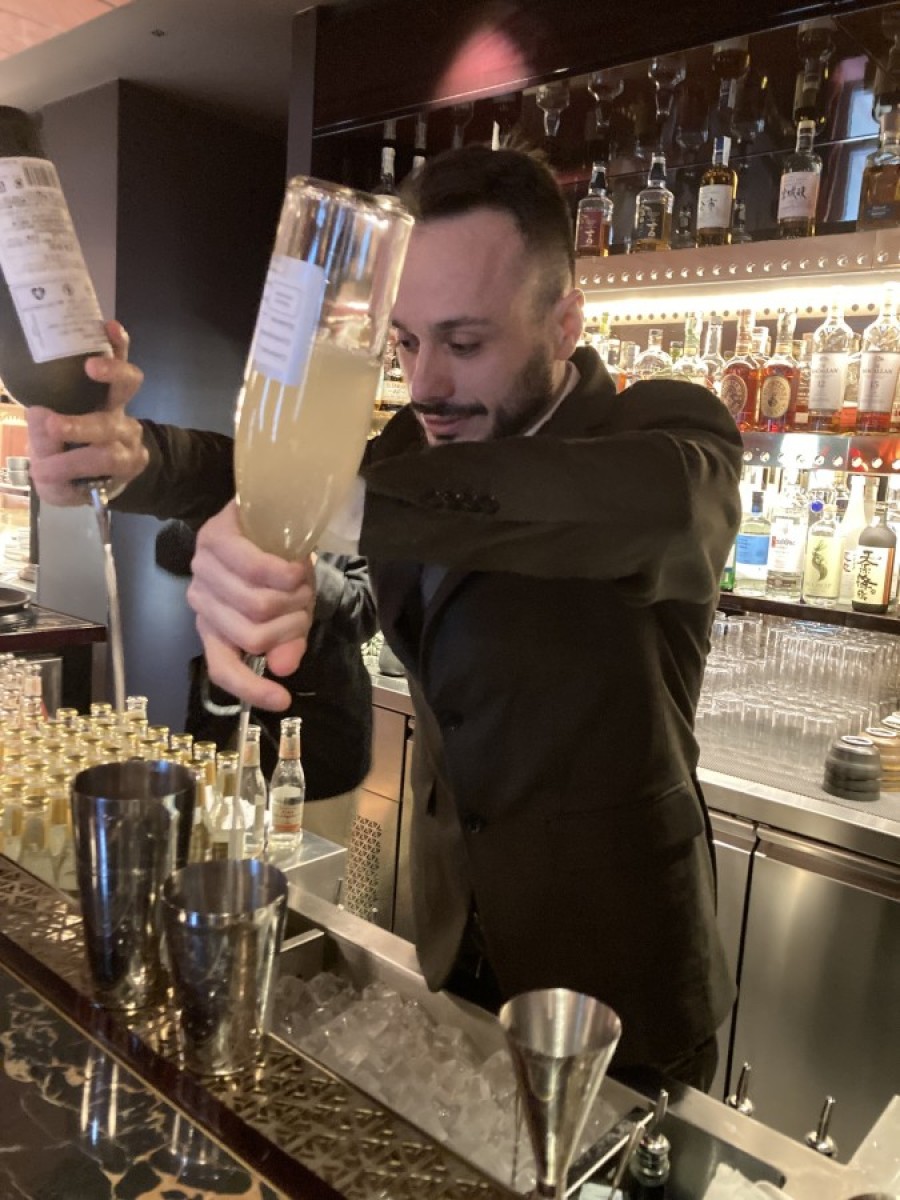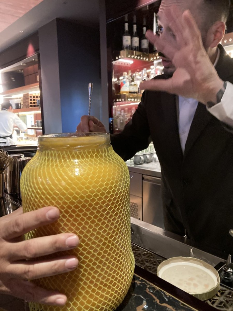 Se il primo cocktail sold out della serata è stato il twist del Paloma, a conferma che è questo il cocktail del momento, quello che ha suscitato più curiosità è stato l’Okazaki Negroni per la particolarità della lavorazione, che ci spiega Masiero «Al Campari abbiamo aggiunto un Yuntaku che è un amaro giapponese creato con uno stile italiano ma con botaniche giapponesi, ma la particolarità è che il cocktail riposa per trenta giorni in un contenitore di cera d’api. Il risultato è molto bilanciato, meno dritto al punto e meno secco di un Negroni classico, e secondo me più complesso per la presenza di diversi ingredienti che si distinguono uno dall’altro. Il riposo in cera d’api inoltre conferisce al cocktail una consistenza setosa».