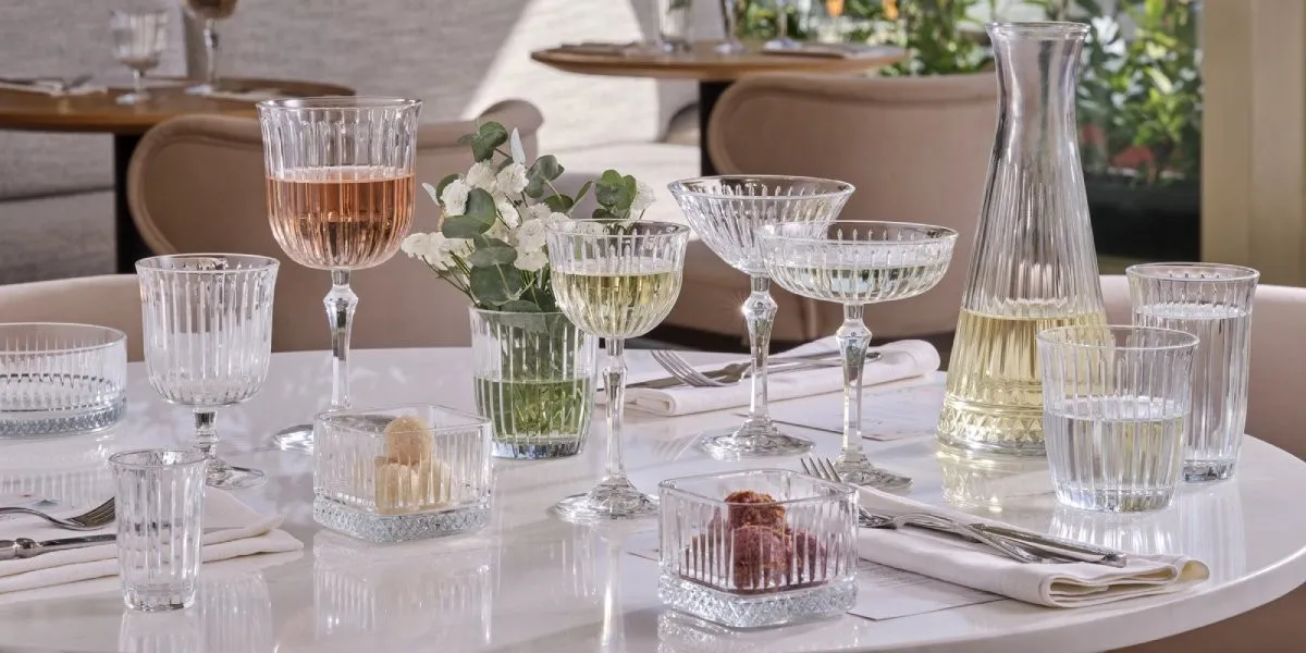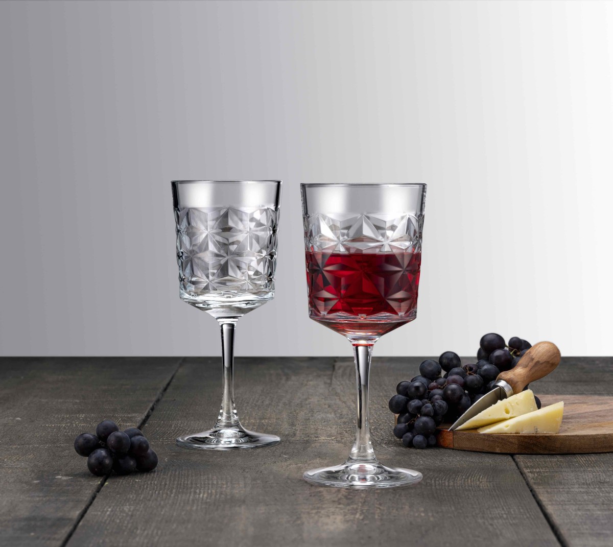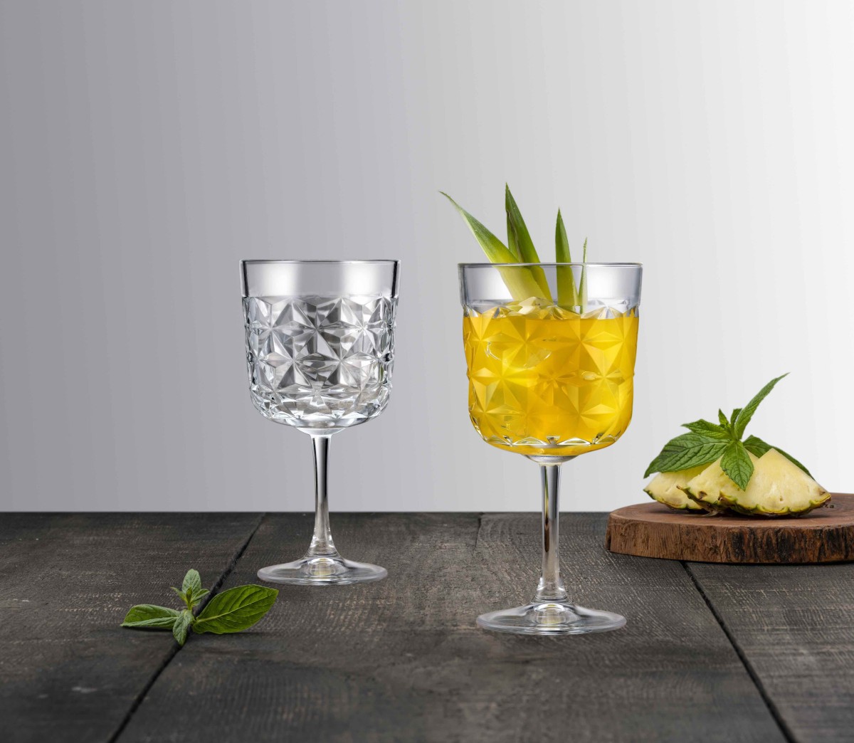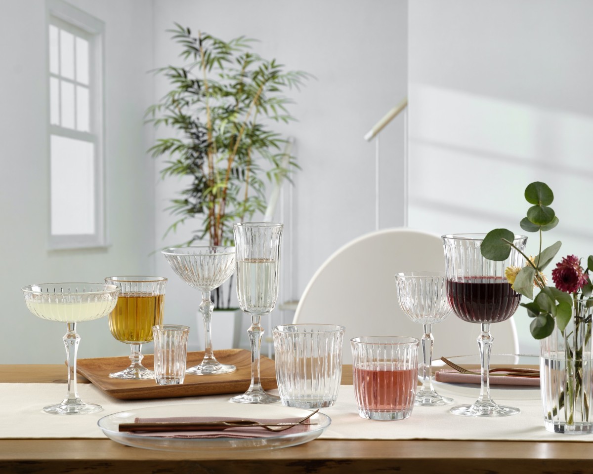 Joy offre un'ampia gamma di opzioni per le bevande proponendo bicchieri con e senza stelo. Il design si rifà all’America degli anni Venti e rende i prodotti ergonomici e piacevoli al tatto grazie alle forme arrotondate, con uno stelo decorato e scanalature verticali perfettamente definite.