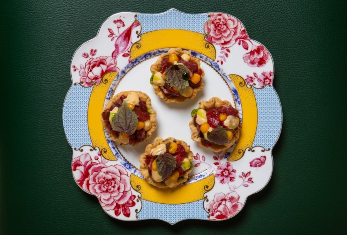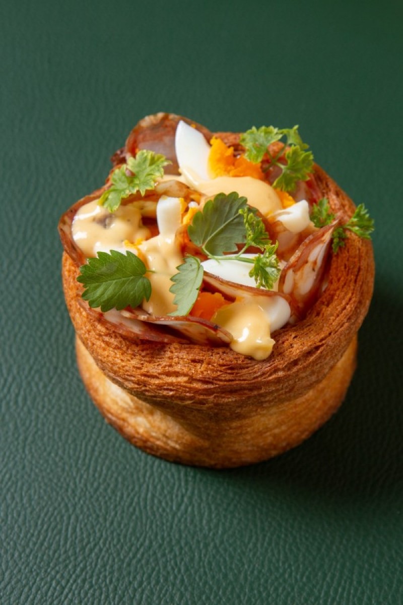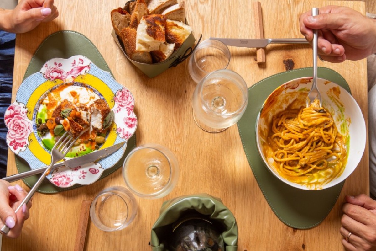 Si parte alle 12.30. Mise en place più informale rispetto alla sera, ma sempre stilosa e curata: tovaglietta in pelle e piatti da boulangerie merlettati e colorati. Oltre all’offerta salata del banco, c’è un menu più semplice rispetto a quello della cena. Circa 12 piatti, tra i quali: Gyoza di ossobuco; Rana pescatrice alla Luciana fritta con salsa di capperi, pomodoro e olive; Manzo marinato alla thailandese; Maccheroncino vegetariano con piselli, basilico e limone compresso; Tartare di manzo con shiso.