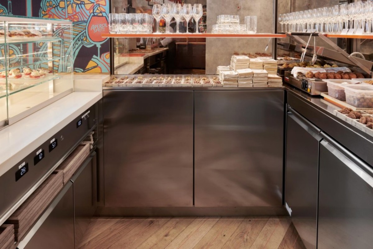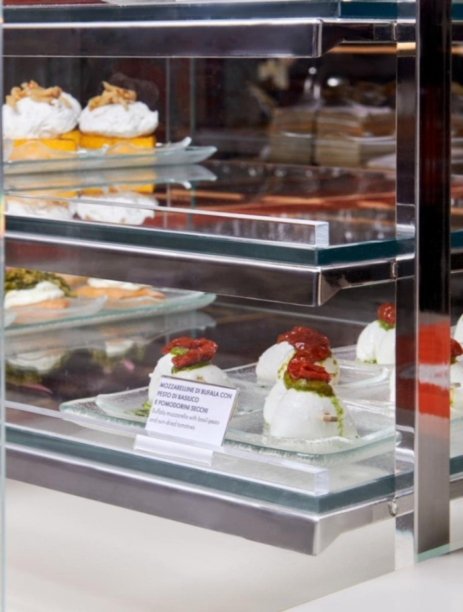 La vetrina ‘cicchetti’, in particolare, è stata realizzata su misura da Prisma, assecondando l’interior e le esigenze di servizio: la struttura a parallelepipedo è in vetro temperato e acciaio inox AISI 304, adatto al contatto con alimenti e inalterabile, e garantisce la massima valorizzazione della proposta gastronomica che risulta così visibile da ogni lato della vetrina. Presenta inoltre un’anta posteriore che permette l’accesso per l’esposizione dei prodotti ed è dotata di temperatura controllata, oltre che di piano inferiore in Corian, a continuazione del banco bar nel medesimo materiale.