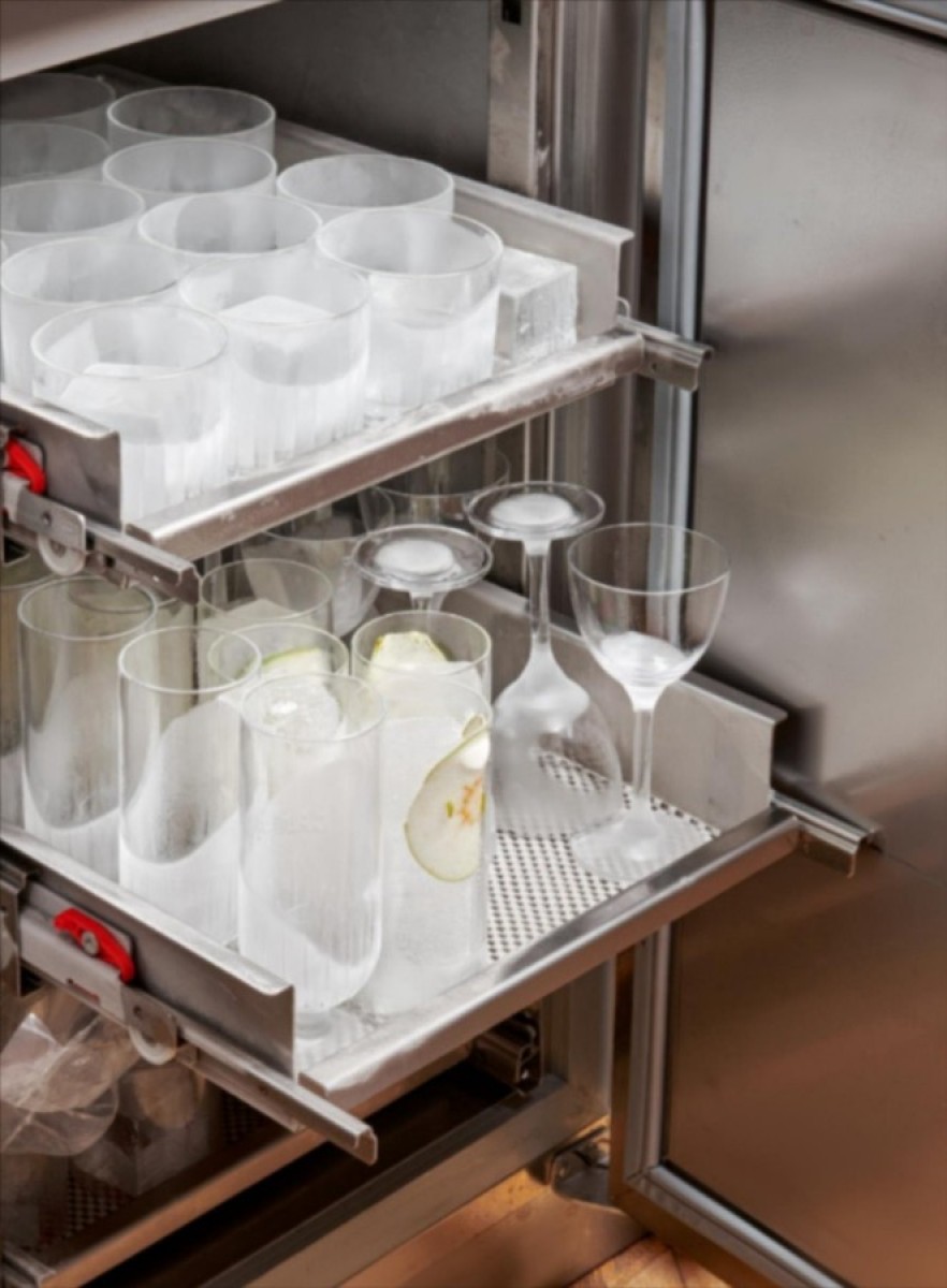 Tutte le componenti tecniche sono celate al di sotto di questo top, così come l’illuminazione diffusa, integrata. A completare il set-up del banco bar è un blocco operativo a U in acciaio inox AISI 304, sempre realizzato su misura da Prisma: è equipaggiato con celle refrigerate e freezer a temperatura diversificata, moduli a cassetti estraibili ad alta portata, vani anche a giorno per lo stoccaggio di stoviglie e altri accessori utili al servizio e alla preparazione degli alimenti.