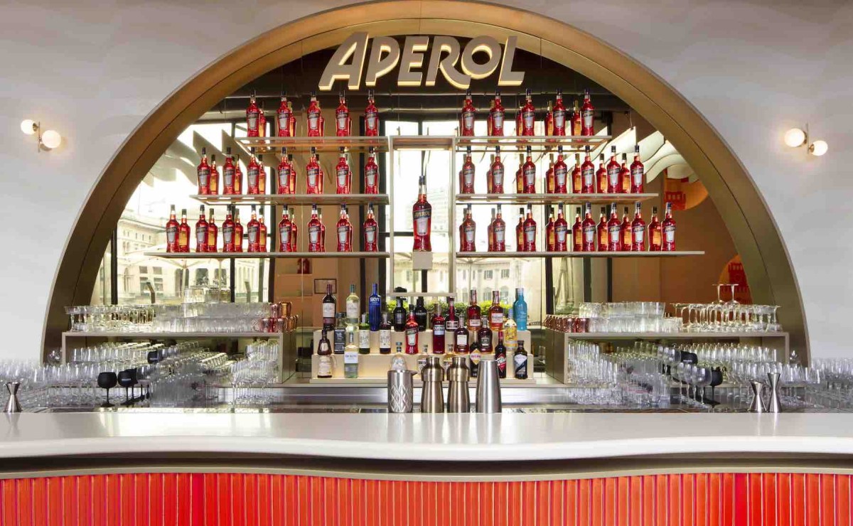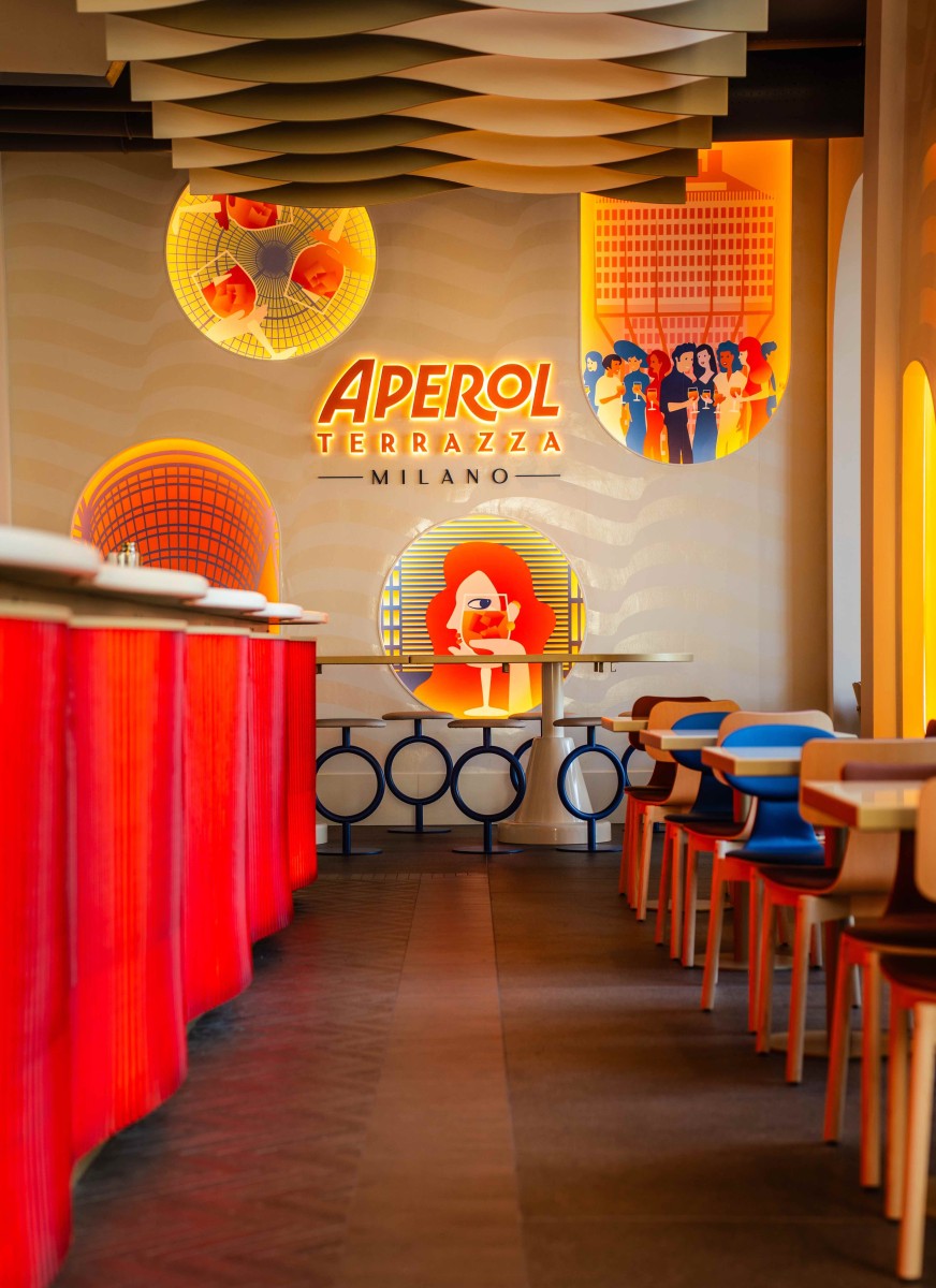 Varcando la soglia, si viene avvolti da riflessi ambrati e giochi di luce: superfici a specchio che catturano le calde sfumature di Aperol Spritz evocano il tramonto sulla laguna veneziana e il perpetuo movimento dell’acqua, omaggio alle radici venete del brand. A raccontare il legame tra Milano e Venezia, le illustrazioni vibranti di Vahram Muratyan interpretano i luoghi iconici milanesi e raccontano il rito dell’aperitivo in chiave contemporanea. «Il nuovo layout è un dialogo tra Venezia e Milano, tra la storia di Aperol e il respiro internazionale di Milano, tra i riti che si consumano all’interno e la città - spiega Tiziano Vudafieri, dello studio Vudafieri Severino Partners, che ha firmato il restyling -. Linee fluide, ampie vetrate e una palette di materiali naturali creano continuità tra interno ed esterno, trasformando lo spazio in un’estensione del paesaggio urbano. La terrazza panoramica, arredata con tonalità calde e texture materiche, si affaccia sul Duomo offrendo una vista che amplifica il senso di appartenenza alla città e rende l’aperitivo un momento da celebrare».