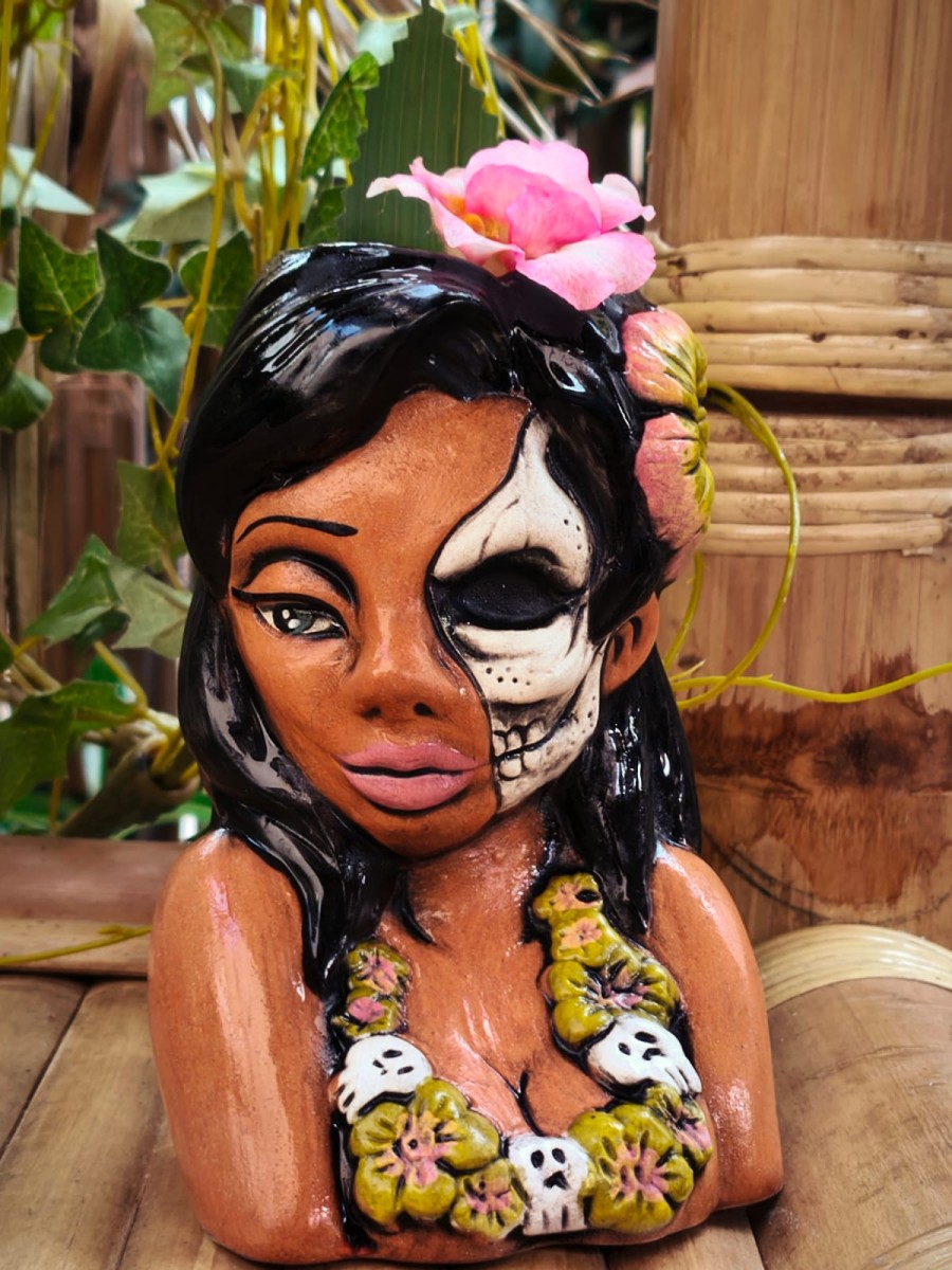Versare il composto cremoso nella tiki mug a forma di testa di Hula Girl versione zombie.