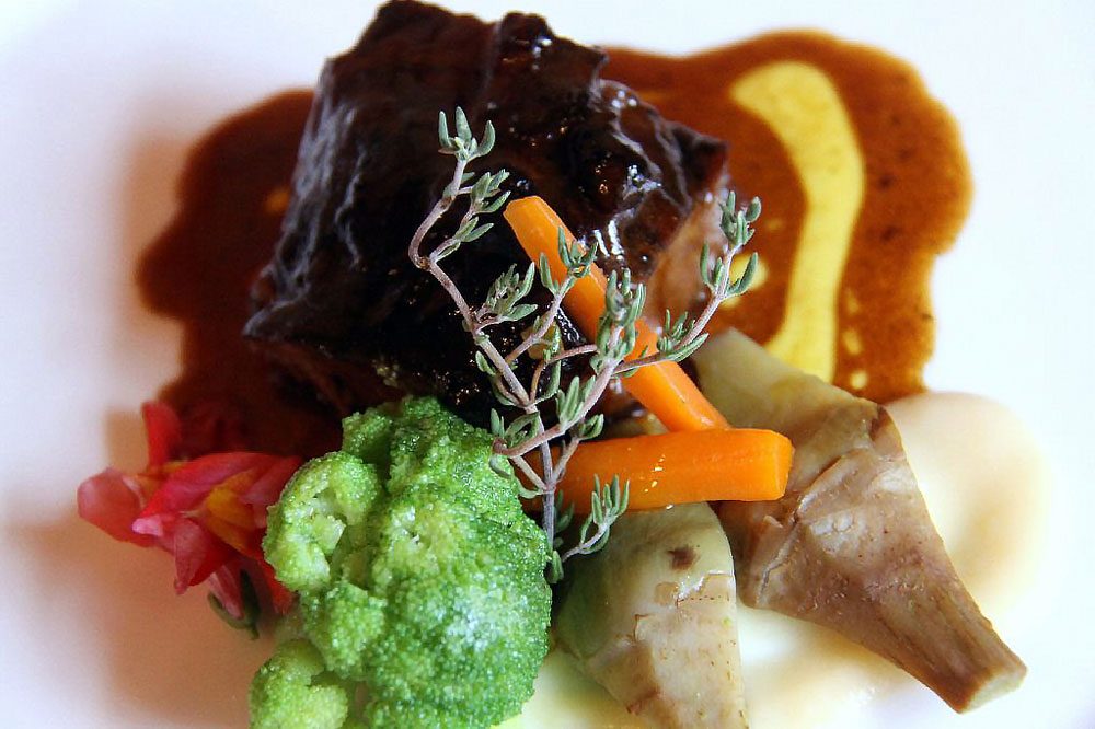 Guancetta di vitellone di razza Modicana brasata alla Pilsner Urquell e cioccolato speziato allo zenzero