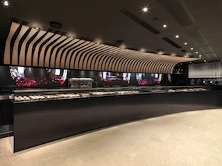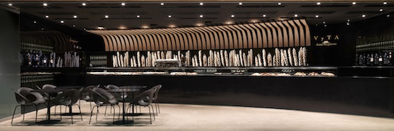 Il bancone ha una forma fluida, una morbida linea curva enfatizzata da una vela sospesa al soffitto, realizzata con doghe in legno di rovere naturale che rievocano l’intreccio delle tradizionali ceste per il pane, la parete del retrobanco, attraverso l’installazione di videowall, celebra gli ingredienti caratterizzanti i prodotti Vyta Santa Margherita come: acqua, vino, olio, grano, farina, mozzarella pomodoro e fuoco.