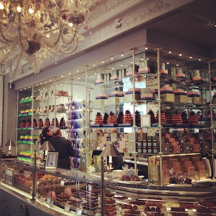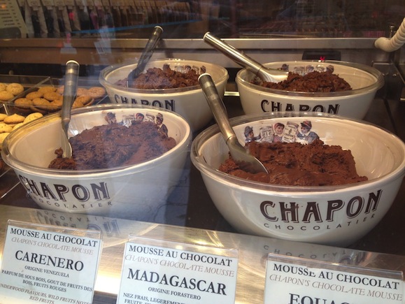 Tracce della stimolazione sensoriale si trovano invece nel negozio Chapon, ancora una volta in Rue de Bac: qui l’esposizione è costruita intorno al prodotto simbolo, la crema di cioccolato. Che troneggia nella piccola vetrina in tutte le sue varianti e viene preparata sotto gli occhi dei clienti.