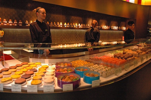 E all’interno, la sensazione non cambia. I colori dominanti sono scuri ed eleganti, i materiali preziosi, la vendita self service è riservata a pochi prodotti complementari (anche in questo caso, destinati a rafforzare il culto del pasticcere, dai libri di favole al merchandising brandizzato) e dietro l’imponente bancone che si snoda uno stuolo di addetti in divisa nera serve i macarons, proposti in decine di varianti dolci e salate, disponendoli nelle scatole come se si trattasse di perle preziose.