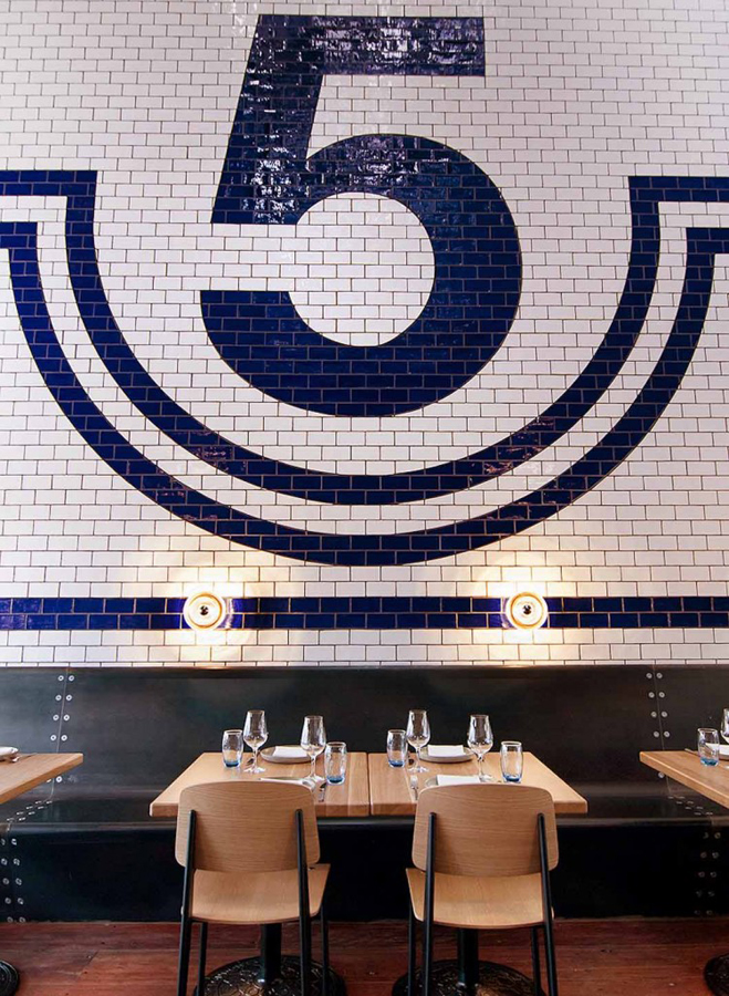 A Melbourne, ad esempio, sul nuovo lungo fiume a South Wharf è stato progettato Shed 5, in coerenza con la nuova estetica industriale sviluppatasi in questa vasta area dedicata al cibo. Progettato dallo studio Loop Creative Shed5 è un ristorante greco con una caratteristica unica: una grande parete rivestita di piastrelle disegna il numero 5 nei colori blu e bianco. Questa parete sembra essere lì da sempre, sembra appartenere a quel luogo.