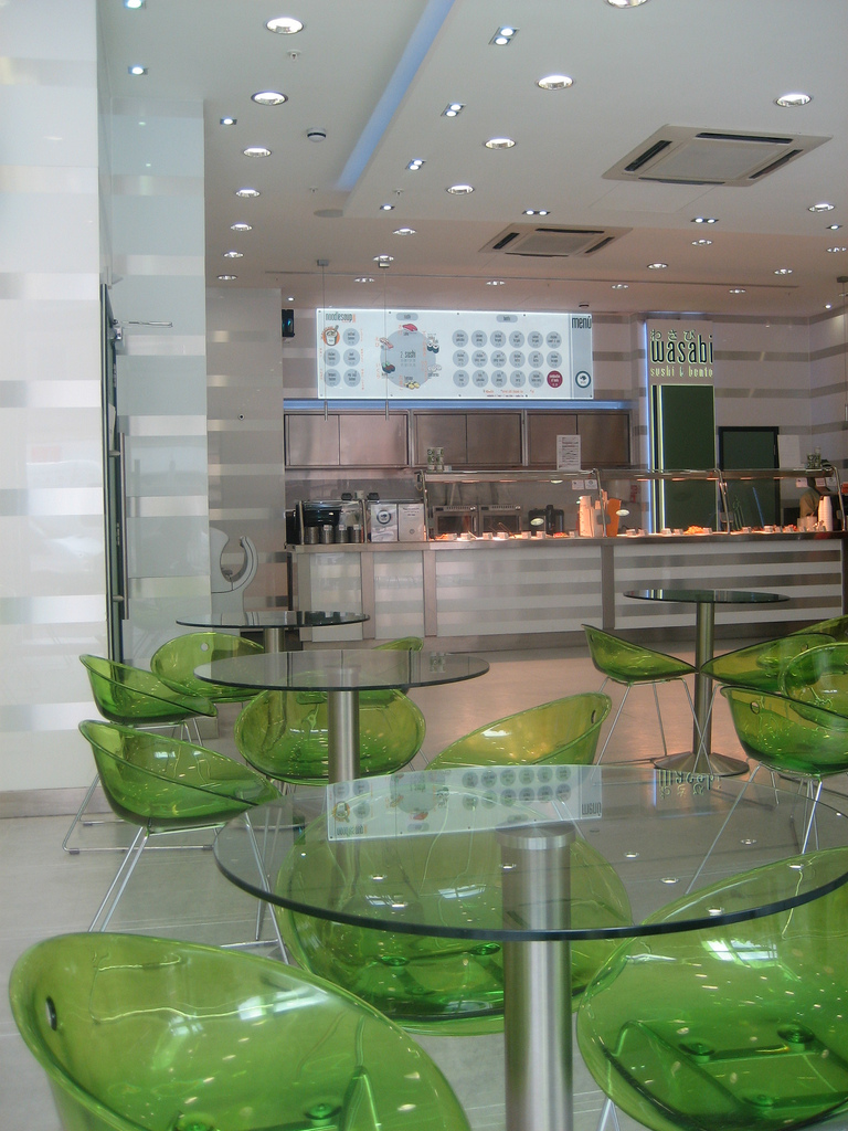 Il sushi non è più un prodotto di lusso costoso e accessibile a pochi ma si trasforma, come da tradizione giapponese, in un prodotto per tutti e il format rispecchia questa filosofia. I locali sono molto luminosi e le tinte percepite sono tra i bianchi e i verdi che richiamano la freschezza del prodotto. L’acciaio dei frigoriferi a libero servizio dove sono ordinatamente posizionate le confezioni comunicano pulizia e ordine. Le location in cui sono inseriti i ristoranti sono prettamente commerciali: nelle stazioni ferroviarie, nelle metropolitane e nei maggiori nodi della città, anche esternamente su strada con chioschi temporanei,oltre che nelle food court dei grandi mall commerciali. Il target di riferimento si apre a ventaglio: dai businessman in cerca di qualcosa di leggero e buono per il pranzo agli studenti in cerca di qualcosa di veloce e a buon mercato. I Wasabi offrono sia la possibilità di consumare il pasto al loro interno sia quella di accedere al KitTakeAway. La cura del progetto grafico e della scelta dei pack è studiata molto bene, come solo sanno fare gli inglesi, che in comunicazione sono maestri.