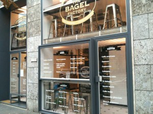 I bagel vengono preparati freschi tutti i giorni e farciti con ingredienti naturali. L’offerta è quella della tradizione americana: Bagel arricchiti con prodotti diversi (pollo, salmone, formaggio, uova, e verdure). Durante l’ordinazione si possono inoltre scegliere tra i diversi bagel arricchiti sul top da semini differenti. Oltre alle ciambelle salate è possibile assaggiare dolci tipici americani come i Muffins, i Brownies, e diversi tipi di Ice Cream. A completare l’offerta in stile c’è anche il tipico caffè americano. L’elemento di intrattenimento è la preparazione a vista dei Bagel che viene esposta grazie ad una parete vetrata. Il design richiama i diners americani, piastrelle diamantate ferro e acciaio i materiali, il logo con una grafica retrò racconta lo spirito del locale. Essendo un format di ristorazione veloce prevede sgabelli alti con mensolone in cui sono posizionati i classici accessori per il caffè e per mangiare sul posto. Il pack è pratico anche per l’asporto e il sistema veloce della preparazione dei panini permette di accedere ad un lunch quick & easy! L’immagine del locale è coerente con l’offerta del prodotto a tal punto da poter immaginare di essere altrove e la qualità generale del locale è decisamente percepibile.