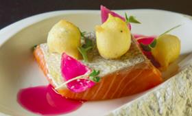 Salmone selvaggio, bignè al caprino, estratto di cipolla rossa[/caption]