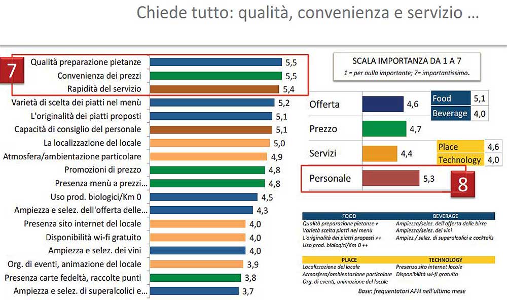 IL SERVIZIO - Per anni lasciato nell’ombra, è elemento oggi discriminante, a tutti i livelli. La rapidità con cui si viene serviti è essenziale (il tempo è denaro), e in questo un aiuto può venire dalle nuove tecnologie, con app sempre più evolute che consentono ad esempio di ordinare prima di arrivare al ristorante, e pagare con un tocco dello schermo. Nell’alta gamma poi l’attenzione in sala e la capacità degli addetti di comunicare e consigliare un prodotto, un ingrediente, un processo, ma anche la ragione di un prezzo, è fondamentale. A riprova di ciò, nella scala degli elementi che determinano la scelta di un locale il personale svetta addirittura al primo posto, mentre fanalino di coda sono a sorpresa le dotazioni tecnologiche (sito web e wi-fi gratis). Ma attenzione: è un dato che dipende molto dal tipo e dalla frequentazione dell’esercizio. Se nelle pizzerie è fondamentale la rapidità di servizio, al ristorante di fascia medio-bassa si richiedono menu a prezzi fissi e a quello medio alto atmosfera, ambientazione e prodotti particolari.