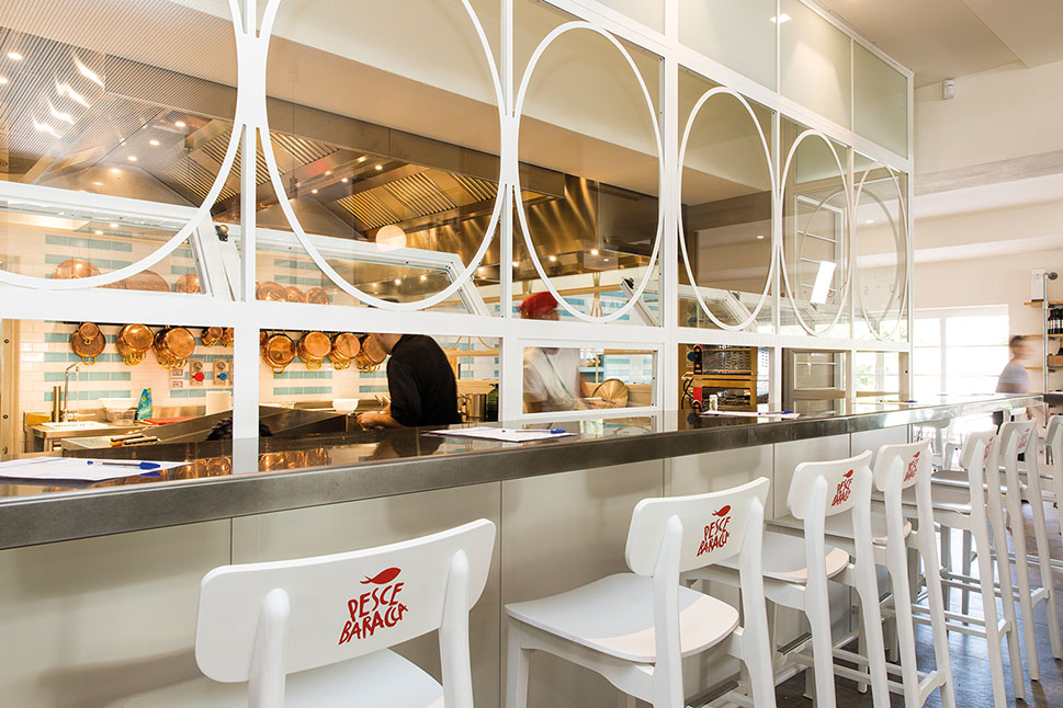 Vetrate decorate a incorniciare la cucina, ceramiche a righe bianche e azzurre per il banco gastronomia, eleganti divanetti e sedute colorate per la zona ristorante, l’azzurro e il rosso del logo e delle divise di Pesce Baracca e la predilezione per il marmo, nella scelta dei materiali, in onore al territorio e alla sua tradizione, con il banco del pesce riccamente lavorato e un vasto assortimento di pesce sempre fresco, che riporta idealmente all’atmosfera delle pescherie di una volta. E a eliminare ogni odore indesiderato, Pesce Baracca ha pensato anche a questo, le scenografiche bocchette di aerazione rosse che scendono dal soffitto: siamo pur sempre a Forte dei Marmi.