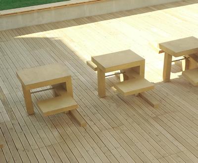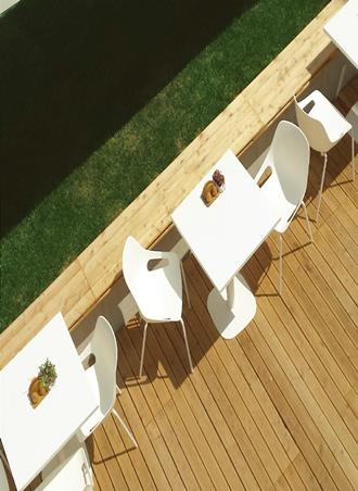 Le sedute a dondolo per ragi ona re sul tema dell ’equili brio Il padiglione Lituano progettato dagli architetti “JAS” di Kaunas si intitola “ Balansas”. Il concetto di bilancia, da cui appunto il nome, viene espresso attraverso le forme pure dell’architettura del padiglione. Due volumi bilanciati che permettono di presentare la Lituania come un Paese dalle tradizioni uniche e dalle tecnologie innovative. Questi due elementi sono connessi con una passerella aperta che li unisce garantendo il flusso dei visitatori fra le due aree del padiglione che fisicamente altrimenti rimarrebbero divise. Il concept rappresenta l’equilibrio tra la tradizione e l’innovazione quali elementi caratterizzanti il settore agroalimentare del Paese. Il ristorante si sviluppa lungo la grande terrazza a doghe di legno tagliata nel verde a piano terra. All’ombra della passatoia fra i due edifici sono stati posizionati longitudinalmente le sedute a dondolo di legno che richiamano il concetto della bilancia. Questi dondoli creano un’interazione diretta con l’utente esprimendo in maniera chiara l’idea concettuale dei designers. L’idea dell’equilibrio infatti viene raccontata anche attraverso il disegno degli arredi. Adiacenti al prato è situata una seconda fila di sedute, questa volta bianche come il padiglione. L’area tecnica del bar-gastronomia è frontale l’ingresso a piano terra dell’area espositiva. Questo patio, interno e protetto, è un’area che risulta molto confortevole, le doghe di legno della pavimentazione e gli edifici