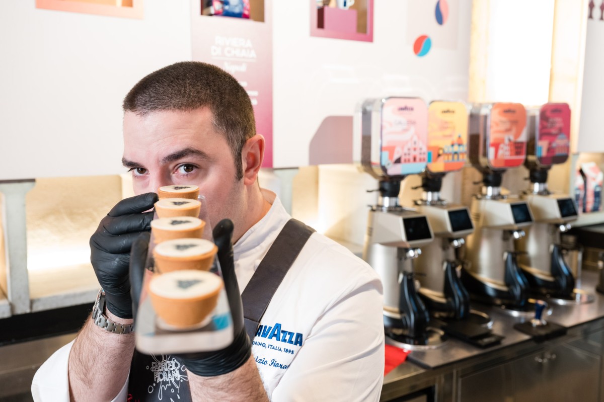 Una partner d’eccezione, Fabrizio Fiorani, pastry chef di fama internazionale, ha omaggiato i Tales of Italy di Lavazza con abbinamenti dedicati alle quattro città ispirati alla pasticceria regionale rivisitati però in chiave contemporanea. Sono nati così “Il miglior Risotto di MIlano” per Galleria, reinterpretando il mito del panettone in forma di tazzina accostato a Ode a Milano, un cappuccino con la miscela Galleria; “Qualcuno ha detto Tiramisù per colazione?” rende questa specialità un dolce per colazione a fianco di Ode a Venezia, un cappuccino con la miscela per Canal Grande; “Il mio Maritozzo 2.0” diventa quadrato per Trastevere in forma di espresso; e con “Cosa direbbero a Napoli” Fiorani reinventa la sfogliatella, in cui la croccantezza esterna diventa cremosa e croccante l’interno, per Riviera di Chiaia proposto come espresso.