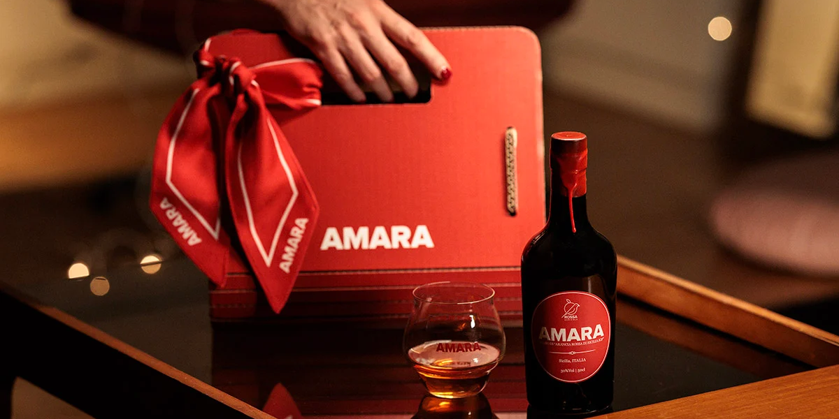 Una borsa in cartone riciclato custodisce un foulard in tessuto ricavato dagli scarti dell’arancia e una bottiglia dell’iconico liquore di Arancia Rossa di Sicilia IGP. Il Xmas pensato da Amaro...