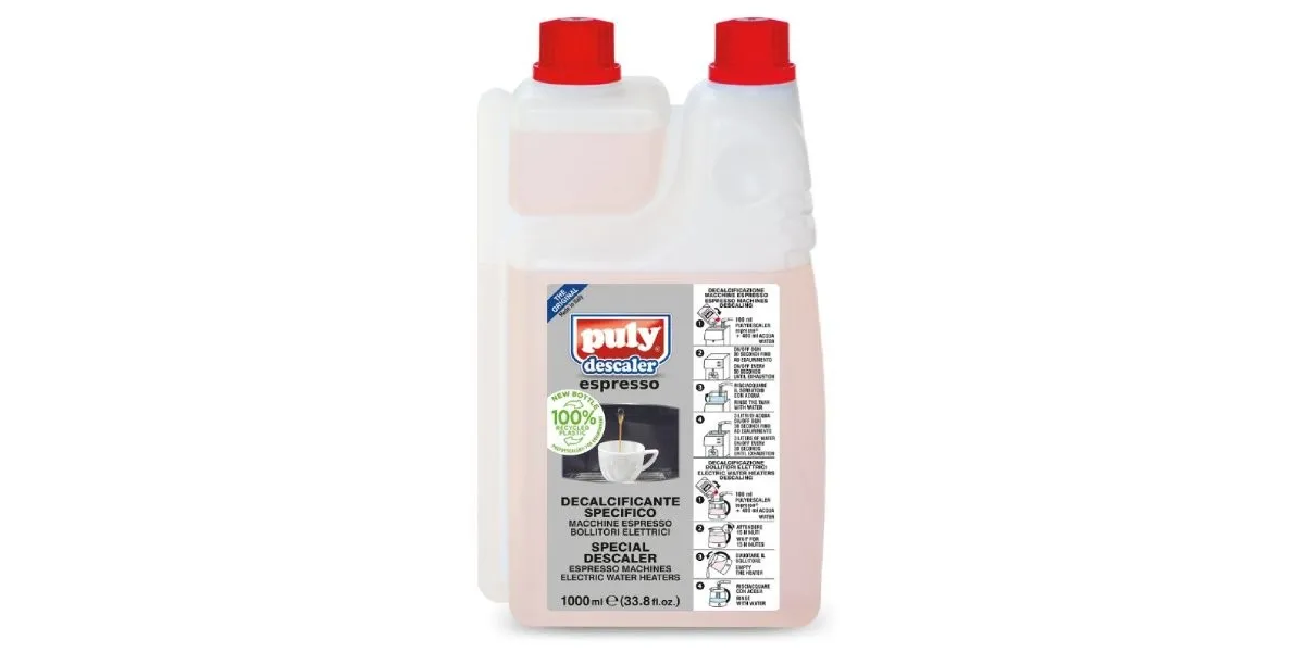 Puly® Descaler Espresso è disponibile nella scatola con 2 monodosi termoformate da 125 ml e nel flacone da 1 litro 100% plastica riciclata con giustadose.