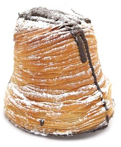 Non è una sfogliatella, non è un babà, né tanto meno un dolce alla ricotta. Una ricetta rimasta per quasi un secolo nella memoria di una storica famiglia di pasticceri partenopei, i Ferrieri, torna a vivere. La sintesi della tradizione pasticcera del capoluogo campano si chiama Sfogliacampanella, un dolce che non finisce mai di stupire con i suoi tre strati di gusto: presenta all’esterno la sfogliata a pasta riccia e dentro, avvolto in un cuore di cioccolato e in una raffinata mousse a base di ricotta, il babà in versione mignon. Sembra facile ma non lo è. Il segreto ènella crema di ricotta miscelata. Un dolce che invita chi lo assaggia a prendersi del tempo, obbliga i golosi a concedersi diversi momenti di piacere assaporando la tradizione che lo accompagna e magari cercando di indovinare la sua antica e preziosa ricetta.
